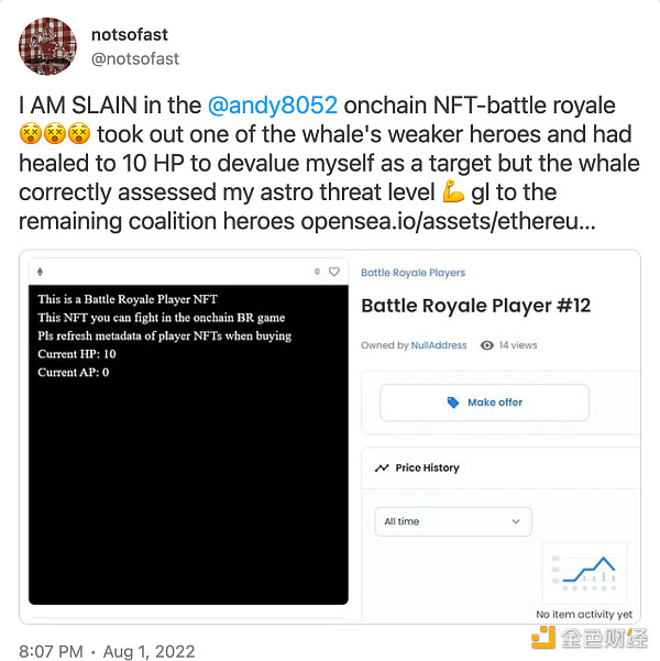 到目前为止,我们已经看到了很多关于简单方面的实验。例如,andy8052(Tessera 联合创始人)的《Battle Royale Onchain》。非常简单但很有趣!
