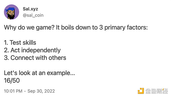 当谈到“是什么造就了一款优秀的 NFT 游戏”时,我们必须回到游戏的基本原理上。为此,我们首先必须了解人们玩游戏的原因,我认为 Sal.xyz 在上面的推文中完美地描述了这一点:测试我们的技能,拥有独特的独立体验,并与他人建立联系。