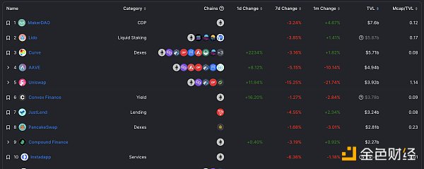 DeFi项目锁定资产前十排名及锁仓量 数据来源:defillama
