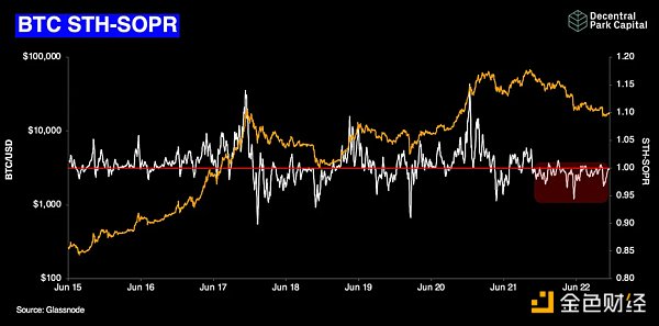 内容:到 2022 年,比特币的短期持有者支出产出利润率 (SOPR) 将被抑制在 1 以下。该指标反映了链上所有代币的实现利润程度。