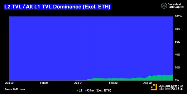 内容:L2 总价值锁定与替代 L1(Alt L1) 的主导地位在 2022 年从 3% 增长到 10%。