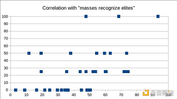 “大众认可精英”和“精英监督专家”相关性高。第二个比第一个高,尽管Hanson和我可能对“recognize”有不同的理解。“意向结构”图表的右下角是空的,但左上角是完整的,这表明意向结构是必要的,但不足以使某物成为制度。