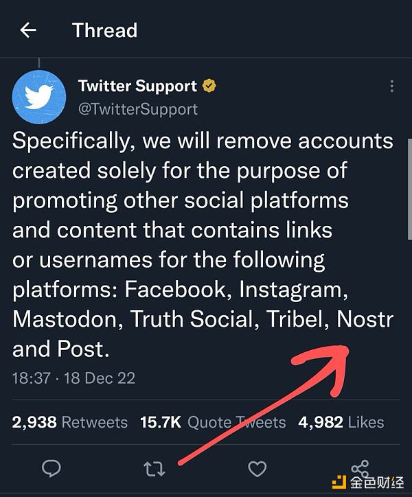12月18日,推特官方宣布对宣传含有其他社交媒体链接的用户封号,这些社交媒体中包含有Facebook、Instagram、Truth Social、Mastodon等,Nostr赫然在列。
