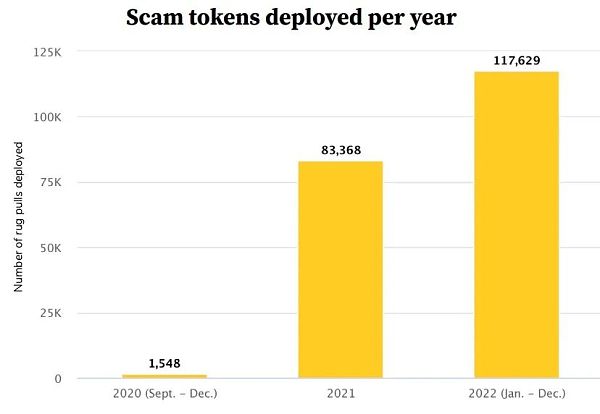 根据Solidus Labs的统计,2022年部署的代币使2020年9月以来的总数超过了20万个。近200万投资者因代币项目方rug pull而损失了资金。