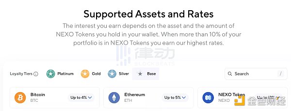 Nexo 官网上可支持的币种的部分截屏,注意 NEXO 在右方
