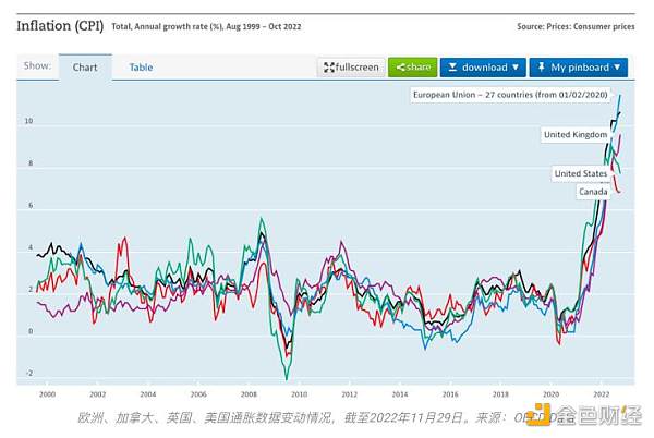 从宏观经济条件看,目前加密市场仍然面临着不断增加的流动性压力。在疫情下,各国通过多次降息与纾困政策,释放大量流动性,以支撑疫情期间的经济稳定。随着大多数国家进入后疫情时代,先前释放的流动性造成的通胀问题亟待解决。尽管目前以美联储为代表的多个主要市场央行已经将利率拉升至较高水平,但通胀水平仍处于相对高位: