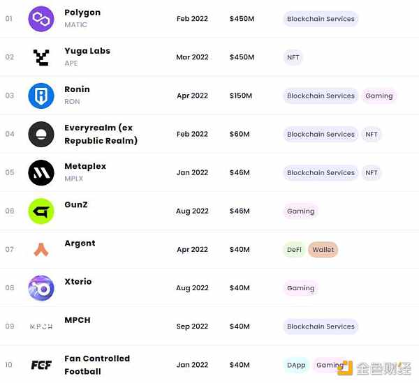 今年 a16z 总计投资了 50 多家企业,主要分布在区块链服务应用、公链和游戏等领域,其中参投金额超过 1 亿美元项目多达 17 个,这点比上文的 Coinbase Ventures 和 Animoca Brands 都要多,一般来说融资超过 1 亿美元的项目都已发展出了一定的竞争壁垒,度过了最早期的发展阶段,这说明了 a16z 更加偏向于相对成熟的加密初创企业,并押注大量资金,当然也进一步表明了 a16z 雄厚的资金实力。