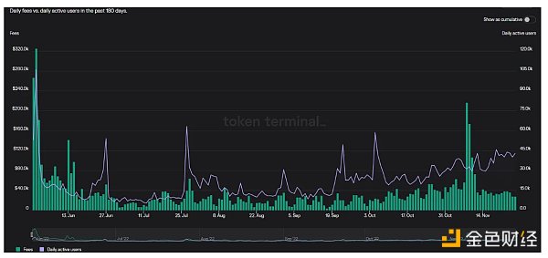 以下是过去180天Optimism的每日费用(绿色)和每日活跃用户(紫色):
