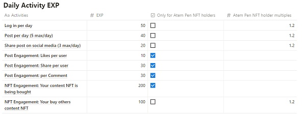 当用户在每日登录AtemReview、创作发布内容、在社交媒体分享内容、主动购买Content NFT 被购买时,都将会获得系统奖励的不同数额的EXP激励。而 Atem Pen NFT 持有者(属Atem 生态内的创作者权益NFT)上述主动行为获得的EXP奖励获得倍数外,当其创作内容被其他用户点赞、分享、评论以及内容NFT被购买后,也将获得额外的EXP激励。 Atem Pen NFT 正在成为AtemReview中,获得高额EXP激励的主要资产。