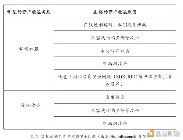 钱包通常具有较高的安全性,它无需信任任何第三方机构,所以钱包用户拥有对其钱包资产的完全的控制权。与中心化钱包相比,用户不必担心银行或交易所挪用资产或者滥用资产管理权限。钱包对中心化机构的依赖较小,受到单点故障与攻击的概率较小,但是当前大部分的钱包使用者是自己负责管理私钥和资产,因此它更容易受到社会工程攻击和病感染等等威胁(表 5 )。