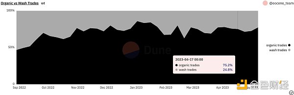 [ 1 ] 自 2023 年 3 月 BLUR 代币推出和奖励季节 3 首次亮相以来,Blur 上的洗盘交易量激增。尽管这也与交易挖矿有关,但 Blur 的奖励机制与X2Y2和 LooksRare 存在显著的差异;Blur 上的洗盘交易更多地是用户冒险行为的“不幸”结果,而非故意行为。有关这种交易是否应被视为洗盘交易的 争论 一直在持续中。在本文中,我们将重点关注故意的洗盘交易,也就是以X2Y2和 LooksRare 占主导的类型。