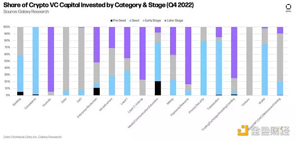 发生在 Web3 领域的投资占据了大多数,而与「交易」相关投资金额占比更高。Web3 领域的融资继续引领着 VC 投资,占到 2022 年第四季度所有完成交易的 30% 以上,大量早期公司正在 Web3 领域进行构建,特别是在 NFT 子领域。此外,为交易、投资构建平台与工具的公司继续在融资金额方面占据主导地位,这表明市场基础设施在加密生态系统中的重要性和日益成熟。