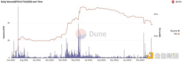 Dune 数据显示,进入 2022 年,NFTX 在半年时间里 TVL 翻了 2.7 倍,但在之后开始持续下滑。截至 5 月 16 日,NFTX 的 TVL 为 3043 万美元,较 1 年前下降约 13.8% 。同时,过去一年日交易量最高为 1910 ETH,与 5894 ETH 的历史新高相差甚远。