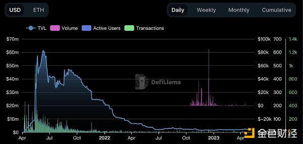 而据 DefiLlama 数据显示,截至 5 月 16 日,Unicly 的 TVL 为 213 万美元,自 2021 年 9 月后就开始持续下滑,而在 2021 年 6 月其 TVL 一度超 6100 万美元。不仅如此,Unicly 的日交易笔数和活跃用户数也下滑至个位数。另外,从月交易额来看, 2023 年至今仅成交了 5.5 万美元,仅为 2022 年 12 月 23.6 万美元交易额的约五分之一。