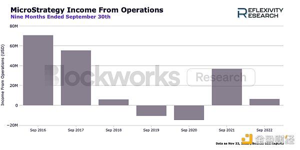 围绕 Michael Saylor 和 Microstrategy 的流动性状况及其偿还债务以维持其杠杆比特币地位的能力的短期担忧似乎是错误的。目前,该公司的资产负债表上有 8.5 万个流动的 BTC,如果比特币跌到 1.35 万美元以下,将其 Silvergate 贷款的 LTV 推到 50% 以上,Microstrategy 才需要增加抵押物。相较而言,更合理的担忧是该公司在未来几年偿还融资的能力。假设其资产负债表上目前的 6700 万美元现金将被用于购买更多的比特币,或因支付利息而被耗尽,那么该公司的软件业务需要提高盈利能力才行。如果其 2028 年高级担保票据的到期日被触发,那么在 2025 年和 2026 年之间 Microstrategy 尤其需要提高盈利。不过,就目前而言,Microstrategy 对比特币市场没有直接风险。