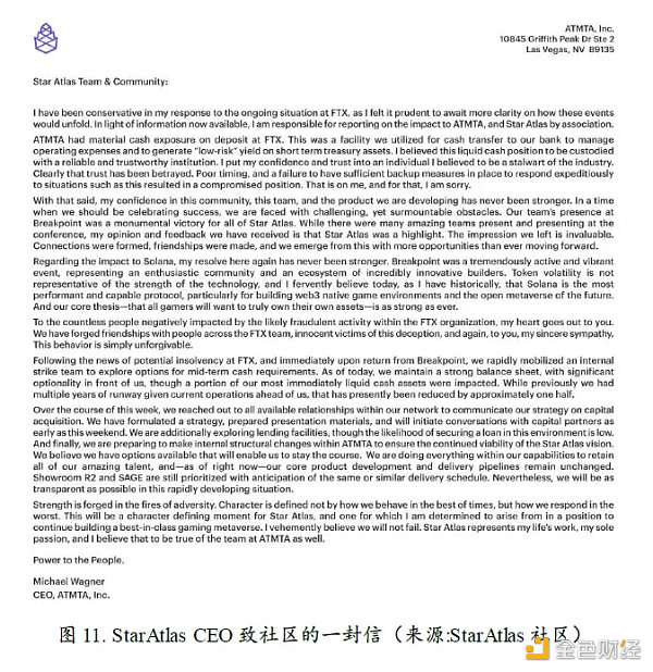 其中,CloneX、Doodles、CoolCats、胖企鹅等NFT几乎没有资金存放在FTX。而影响较大的一个NFT项目是Star Atlas。该项目大约 50% 的国库资金存储在 FTX 上,而且当前游戏开发尚未完成。而我们知道,NFT游戏项目需要大量的资金来开发和运营,这在当前熊市的状况下,毫无疑问是漏船更遭连夜雨。在Star Atlas的CEO Michael 给社区的一封信中我们可以看到该项目在缺乏后续资金的情况下可能将无法继续运营。