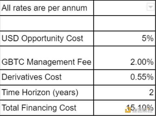 购买GBTC必须使用全额资金,券商不会容许你加杠杆。你要么需要借入美元,要么使用自己的美元资本。这两种情况都是有成本的。假设使用自己的美元购买GBTC。因为你本可以购买年利率约5%的两年期美债,这就是你的资本成本(或机会成本)。