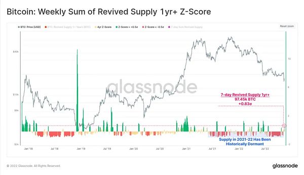 下面的图表展示了超过1年的每周复活供应量总和的4年Z-Score。在过去的一周中,9.745万枚币龄超过1年的比特币已经被卖出,并有可能返回到流动性循环中。