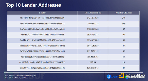 以下为按贷款总额排名的TOP 10贷款人地址信息。截止到5月15日,地址0x048...13a0累积贷款3,421.17 ETH,位居第一。地址0x020...5872累积贷款2,460.86 ETH,位居第二,值得一提的是,该地址为此前声称要推出NFT圈的黄立成地址(以太坊域名:machibigbrother.eth)。