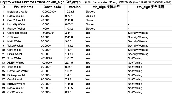 以上是对 Chrome Web Store 商城里的 20 个热门加密货币 Chrome 扩展钱包进行测试的结果,eth_sign 支持情况如下: