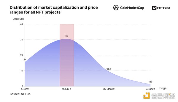 根据NFTGo的数据,超过50%的NFT项目市值在100到1000 ETH(截至2023年4月为0.2M到2.1M美元)范围内。其次是0到100 ETH范围,共有1550个项目。此外,125个项目的市值达到100K ETH及以上。