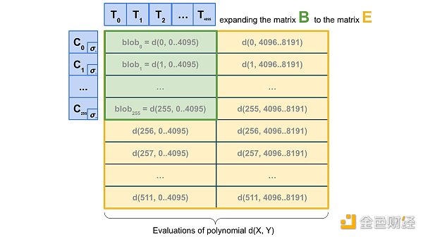 输入:一个danksharding区块B可以包含多达256个数据块(比protodanksharding多64倍),每个数据块是一个?p中的4096个元素的向量。因此,我们可以将一个区块表示为一个256 × 4096的?p元素矩阵。这个矩阵的每一行对应一个客户端的数据块。请注意,每个客户端都向构建者发送一个B的行以及该行的已签名KZG多项式承诺。构建者收集256个已签名的多项式承诺C0,...,C255,每行一个承诺。
