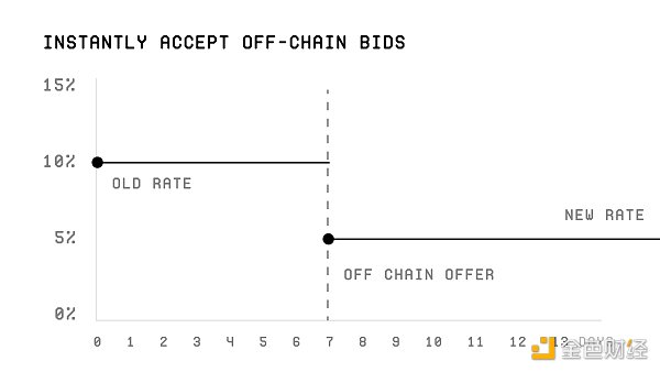 到期时,如果借款人没有偿还债务,再融资拍卖将从 0% 开始,利率稳步上升。一旦拍卖达到新贷方有兴趣放贷的利率,新贷方可以通过在链上提交报价来接受它。新贷方向旧贷方支付全部还款额,从拍卖完成的那一刻开始计算,并接管贷款直到新的到期时间(可以计算为当前到期时间加上一些协议指定的贷款期限) ,使用拍卖达成的利率。