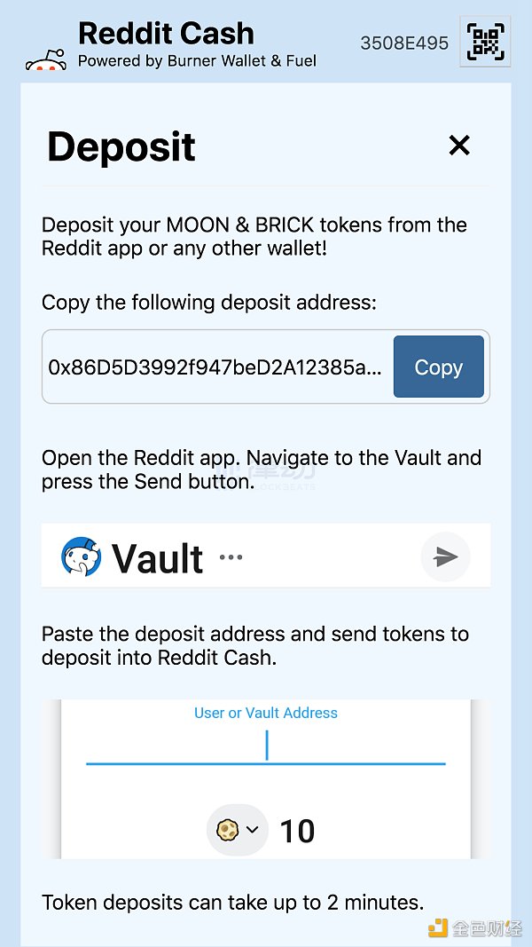 2. 访问存款页面,复制存款地址向下滚动并选择「存款」,然后按照说明操作 (即将地址复制到 reddit Vault 并发送您想要的金额)。