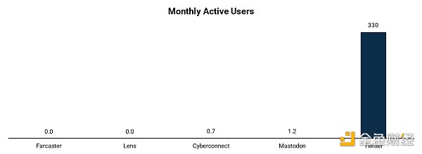 在所有指标上,DeSoc 的采用率比现有平台低几个数量级。Mastodon 和 Damus 上的总活跃用户(两个相对流行的 DeSoc 平台)仍然只是 Twitter 月活跃用户(MAU)的一小部分。没有 DeSoc 网络是明显的赢家——团队仍在试验适当的架构,以提供良好的用户体验同时保持去中心化。