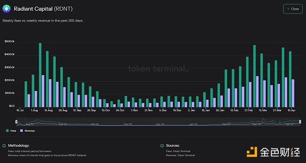 TVL总额为2.3亿美元——一个新的历史新高,2023年一直处于强劲的上升趋势。与其他借贷协议相比,RDNT排在第6位(位于AAVE、JustLend、Compound Finance之后)。然而,RDNT的TVL月增长幅度高达924%……令人印象深刻。