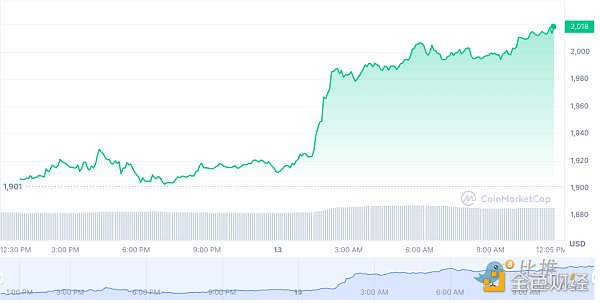 继备受期待的 Shapella 升级完成之后,以太坊正在飙升。比推终端数据显示,按市值计算的第二大加密货币在过去 24 小时内上涨了近 6%,盘中一度突破 2,010 美元,截至发稿时价格为 2,009 美元。
