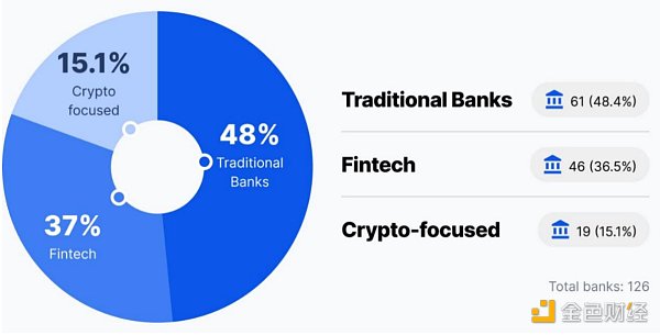目前的加密友好型银行包括三大类:传统银行、金融科技和数字银行,以及专注于加密货币的银行。情况每天都在变化,但在撰写本文时,有61家传统银行为加密行业提供服务,46家金融科技和数字银行,以及19家专注于加密货币的银行。这表明,主流银行越来越适应加密行业,传统银行和新兴金融科技公司都希望利用好这一新兴市场。与此同时,专注于加密货币的银行在支持该行业方面也发挥着至关重要的作用,为加密有关企业和个人提供量身定制的服务。