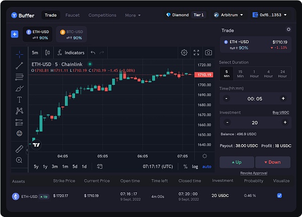 Buffer Finance 是一个去中心化的二元期权交易平台。二元期权不同于永续期权,因为交易者只押注价格上涨或下跌。交易者要么获得固定回报,要么一无所获。