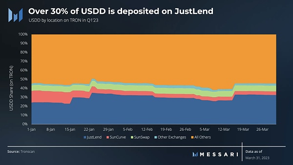 TRON 上几乎一半的 USDD 都参与了其他 DeFi 协议。 JustLend 是 TRON 上领先的借贷协议,已存入超过 2.35 亿美元以赚取收益。尽管供应充足,但对 USDD 的借贷需求并不相称,季度末仅借入 560 万美元。 TRON 上剩余的 USDD 主要在交易所和用户钱包中。