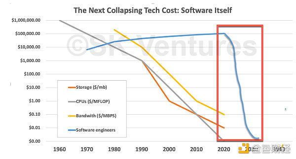 我们现在已经多次提到这个技术债务,强调这一点并不为过。几乎可以肯定,我们生产的软件仍远远赶不上需求。这个技术债的规模有多大我们不知道,但不可能很小,所以后续可能会呈几何级数的增长。这意味着随着软件成本下降到接近为零的地步,可以预见,软件的创建会以之前几乎无法想象的方式爆炸。
