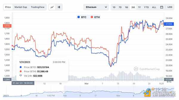 一季度行情即将接近尾声,比特币和以太坊的走势越来越趋同,几乎完全相关。比推终端数据显示,以太坊年初至今 (YTD) 上涨了 50.02% ,但比特币却飙升了 72.30% ,有望创下两年来最佳的季度表现。
