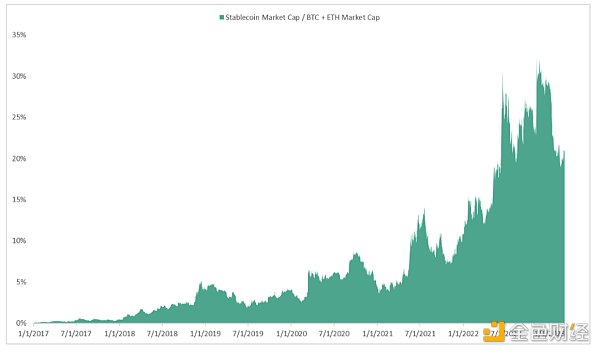 图2:稳定币市值占BTC+ETH市值的百分比(来源:Coinmetrics、Grayscale Research,“稳定币”市值为截至23年3月9日USDT、USDC、BUSD、DAI、GUSD、HUSD、PAX、SAI、TUSD和USDK的总市值)