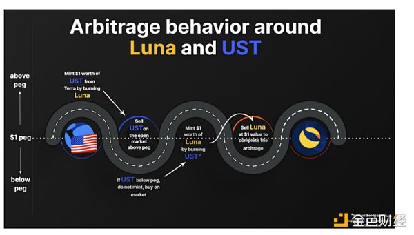 Luna-UST关系的核心是套利机会,每当UST偏离挂钩时,这种机会便会出现。例如,当UST供应走低需求走高时,其价格超过1美元,比如达到1.01美元。为了让UST恢复挂钩,Terra允许用户burn 1美元的Luna并铸造1个UST,该UST可以1.01美元售出,带来1美分的利润。用户可以通过burn Luna来创造尽可能多的UST,直到UST恢复至1美元。