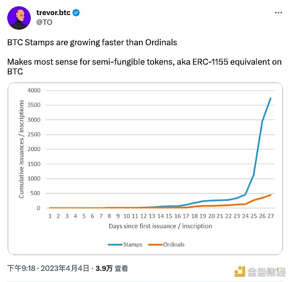 一种叫作 BTC Stamps(比特币“邮票”)的全新比特币 NFT 实现方式已经诞生,且在其问世的头 20 天内,通过该方式所铸造的 NFT 数量要远远超过我们已较为熟悉的 Ordinals 起步时的数据。(关于 Ordinals,可参考阅读《NFT 玩家必读:万字雄文解读 Bitcoin Ordinals》)