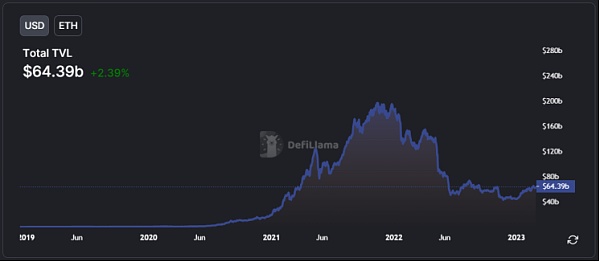 根据Defi Llama的数据,目前以太坊TVL大约644亿美元,比2021年末的最高点(1970亿美元)下降了65%以上。当Terra的UST算法稳定币崩溃时,Defi生态系统也发生了连锁反应,对该行业的信心造成了沉重打击。