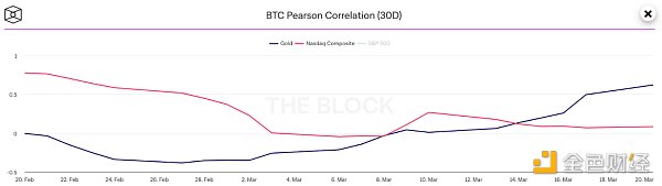 BTC 与黄金和纳斯达克的相关性 - The Block