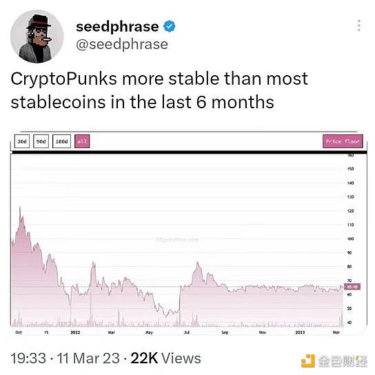 尽管 NFT 交易量整体下降,但 BAYC 和 CryptoPunks 等蓝筹 NFT 的地板价几乎没有受到影响, 3 月 11 日仅略微低于 10 万美元。“复苏”速度很快,显示出这些顶级 NFT 的韧性。