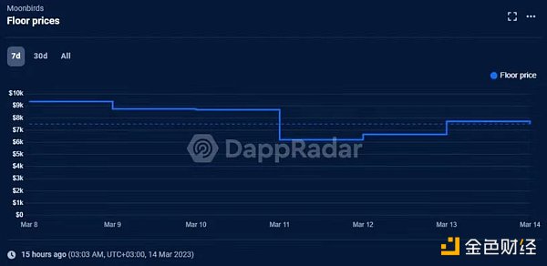 自硅谷银行倒闭消息传出以来,Moonbird 的市值下跌了 18% 。然而,地板价有所回升,达到 6207 美元(4 ETH)。3 月 11 日,一个以太坊地址卖出了近 500 个 Moonbird NFT,损失在 9% 至 33% 之间。该地址在批量销售时实现了 9% 至 33% 的亏损,其中 200 个 Moonbird NFT 的亏损超过 32% 。这些交易都发生在 NFT 市场 Blur 上,总损失超过 700 ETH。