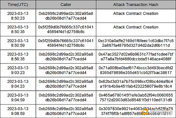 值得注意的是,此次攻击事件共有 6 笔攻击交易,除了第一笔攻击交易为攻击者 EOA 地址 1 发起的外,其他的攻击交易发起人均为攻击者 EOA 地址 2。
