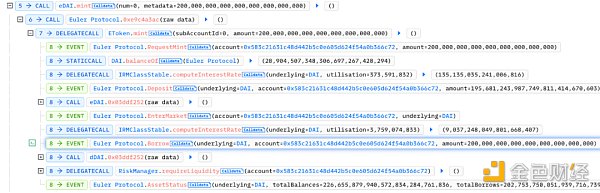 3. 之后调用 mint 函数(self borrow) 进行借款,借出了 195,681,243 枚 eDAI 和 200,000,000 枚债务代币 dDAI。
