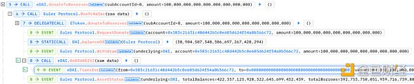 6. 然后调用 donateToReserves 函数将 100,000,000 枚 eDAI 捐赠给储备地址,此时账户中的 eDAI 剩下 310,930,612 枚,而债务代币 dDAI 有 390,000,000 枚,此刻账户处于爆仓状态,但 donateToReserves 函数并没有检查账户的健康系数。