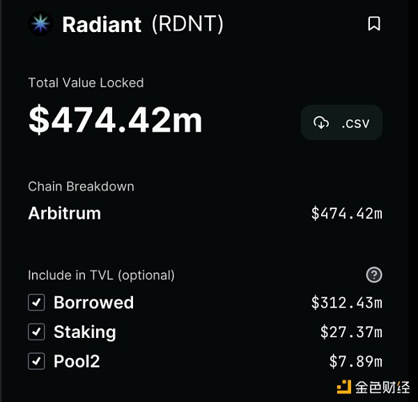 根据 Defillama 的数据,目前 Radiant(RDNT)中存入资产的 TVL 为 1.26 亿美元;如果加上借的、质押的、Pool2 的,则整体 TVL 为 4.7 亿美元左右。