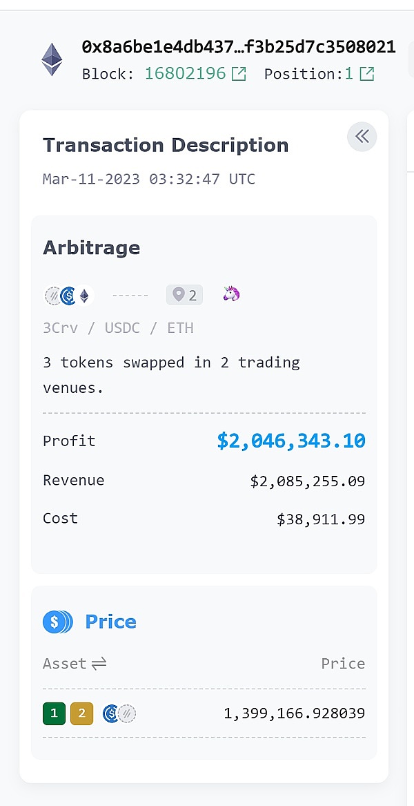 在恐慌挤兑潮和一片市场混乱中,代币价格出现剧烈波动,MEV搜索者反而能够看到获利机会。而成为MEV目标的受害者,则可能不幸承受巨额损失。在本轮USDC挤兑潮中,就出现了一例这样的MEV套利事件。一位地址开头为0x8ff的投资者试图转换其稳定币仓位,想要将其持有的203万个3CRV代币换成USDT(3CRV 为Curve 流动池的LP 代币,由USDT、USDC、DAI 三种稳定币组成),但其并未直接通过Curve解除LP token,而是经由KyberSwap 聚合路由将交易发送给了Uniswap上的一个几乎完全没有流动性(仅有约2美元的流动资金)的LP,这个资金池在过去的 251 天里一直处于闲置状态。