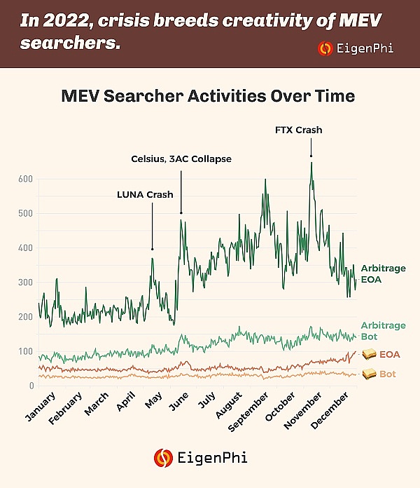 虽然从理论上讲,MEV应该完全由验证者获得,因为他们是唯一能够保证将套利机会付诸实践的一方。然而,实际中MEV并不会完全被验证者所提取,而是可能被称为“搜索者(searcher)”的套利交易者和机器人(MEV-bot)所瓜分。