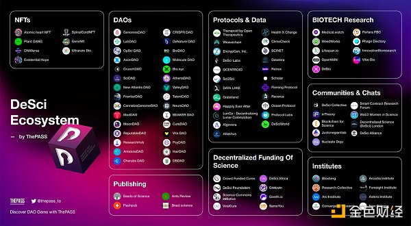 根据 DAO 聚合器 ThePASS 平台统计,以下共汇总 102 个 DeSci 相关组织,分类为 DAOs、BIOTECH Research、Communities、Decentralized Funding Of Science、Institutes、NFTs、Publishing、Protocols & Data,以下为 DeSci 生态图。